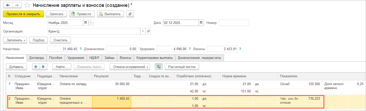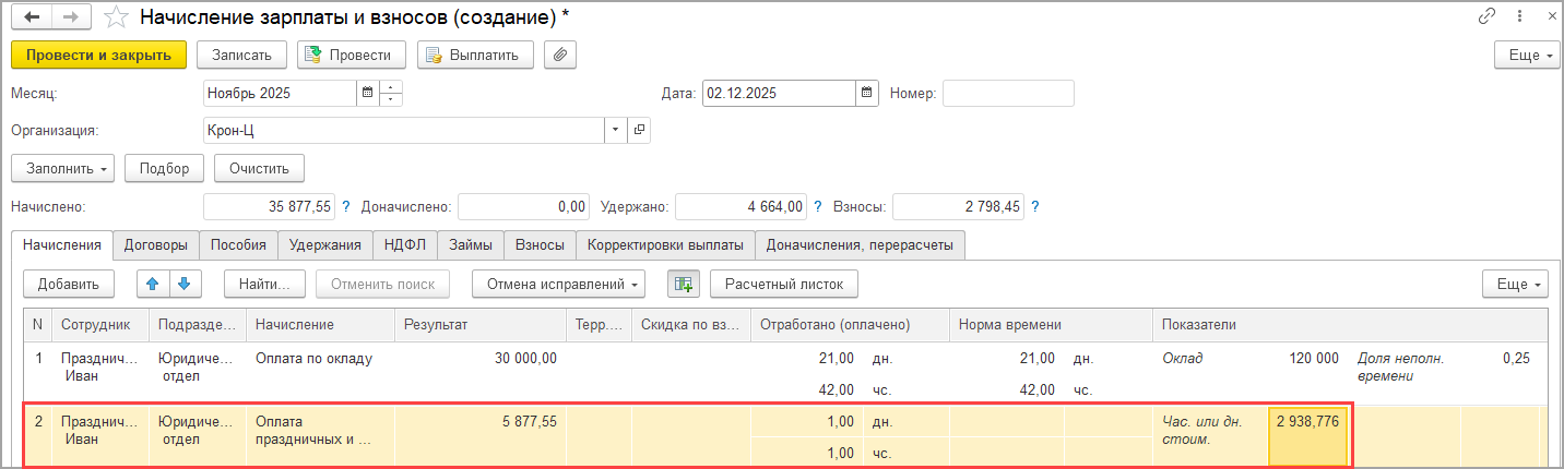 Сотрудник с неполным рабочим днем на оплате по окладу с нормой по своему графику пятидневки с выходными (понедельник, вторник). После проведения документа работа в выходные и праздники оплата за работу в праздничные и выходные дни рассчитывается некорректно.