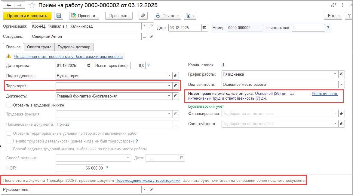 В кадровом приеме появилась запись, что зарплата будет считаться с учетом документа Перемещение меду территориями.